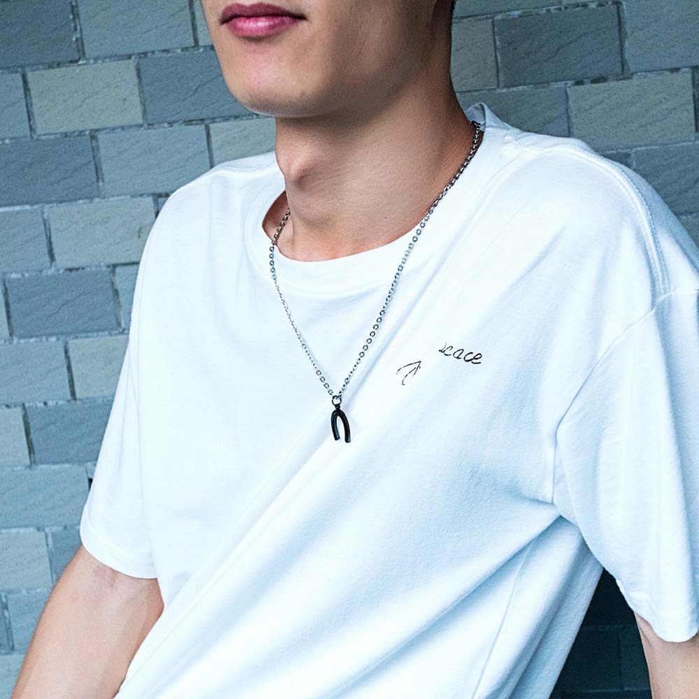 男性用と女性用のどちらにも英語でメッセージをデザインした大人のペアルックネックレス。