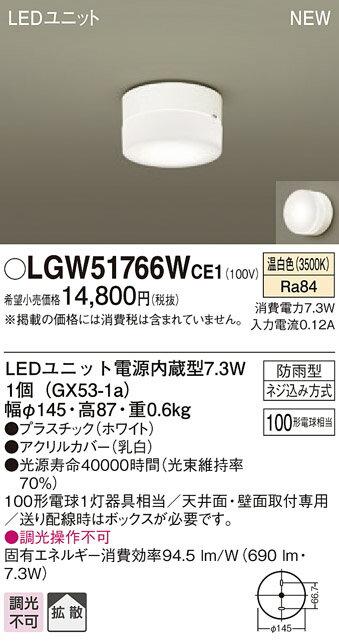 商 品 詳 細商品名パナソニック エクステリアライトメーカー名パナソニック Panasonicメーカー器具名称エクステリアライト ブラケットライト ポーチライト仕様◆LED(温白色) ◆色温度:3500 K ◆光源寿命40000時間(光束維持率70%)◆幅:φ145 mm ◆高:87 mm ◆質量:0.6 kg◆器具光束:690 lm ◆電圧:100 V ◆消費電力:7.3 W ◆消費効率:94.5 lm/W◆デザイン分類:Casual◆【プラスチック】ホワイト◆【アクリルカバー】乳白◆Ra84◆100形電球1灯器具相当◆天井面・壁面取付専用◆送り配線時はボックスが必要です。