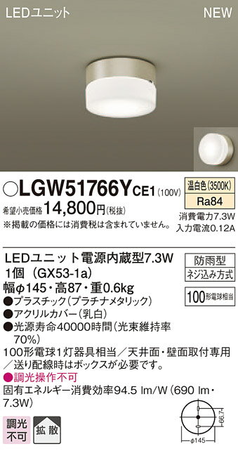 商 品 詳 細商品名パナソニック エクステリアライトメーカー名パナソニック Panasonicメーカー器具名称エクステリアライト ブラケットライト ポーチライト仕様◆LED(温白色) ◆色温度:3500 K ◆光源寿命40000時間(光束維持率70%)◆幅:φ145 mm ◆高:87 mm ◆質量:0.6 kg◆器具光束:690 lm ◆電圧:100 V ◆消費電力:7.3 W ◆消費効率:94.5 lm/W◆デザイン分類:Casual◆【プラスチック】プラチナメタリック◆【アクリルカバー】乳白◆Ra84◆100形電球1灯器具相当◆天井面・壁面取付専用◆送り配線時はボックスが必要です。