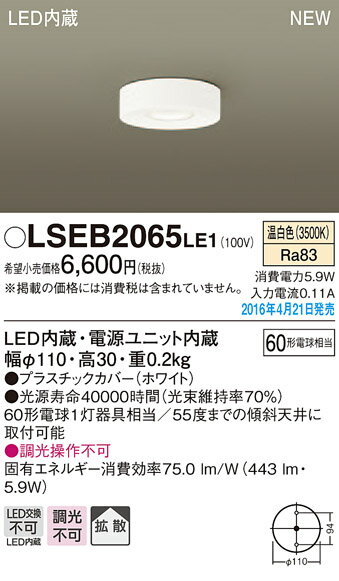 カテゴリ:照明器具 住宅照明 ダウンシーリング メーカー:Panasonic パナソニック 型番:lseb2065le1LED内蔵、電源ユニット内蔵、【ランプ】同梱包※写真はイメージです 2016年6月のメーカー情報に準拠しております。